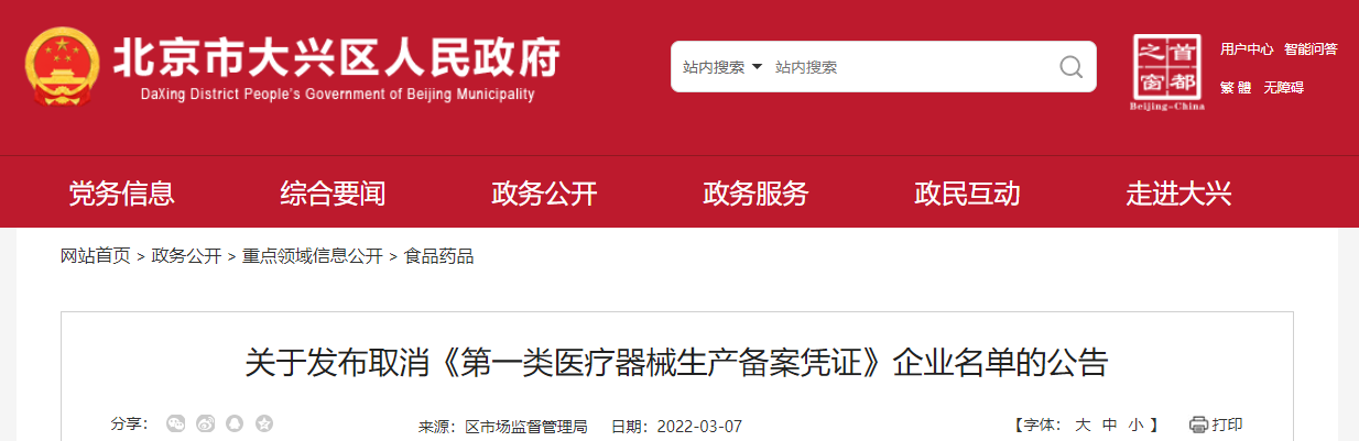 北京市大兴区市场监督管理局关于发布取消《第一类医疗器械生产备案凭证》企业名单的公告