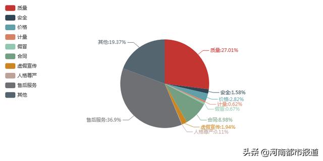 根据投诉性质分类,在所有投诉问题中,售后服务问题占36.89%,质量问题占27.01%,其他问题占19.37%,合同问题占8.98%,价格问题占2.82%,虚假宣传问题占1.94%,安全问题占1.58%,假冒问题占0.67%,计量问题占0.62%,人格尊严问题占0.11%。产品售后服务、质量和其他问题仍是引发投诉的主要原因,占投诉总量的83%以上。