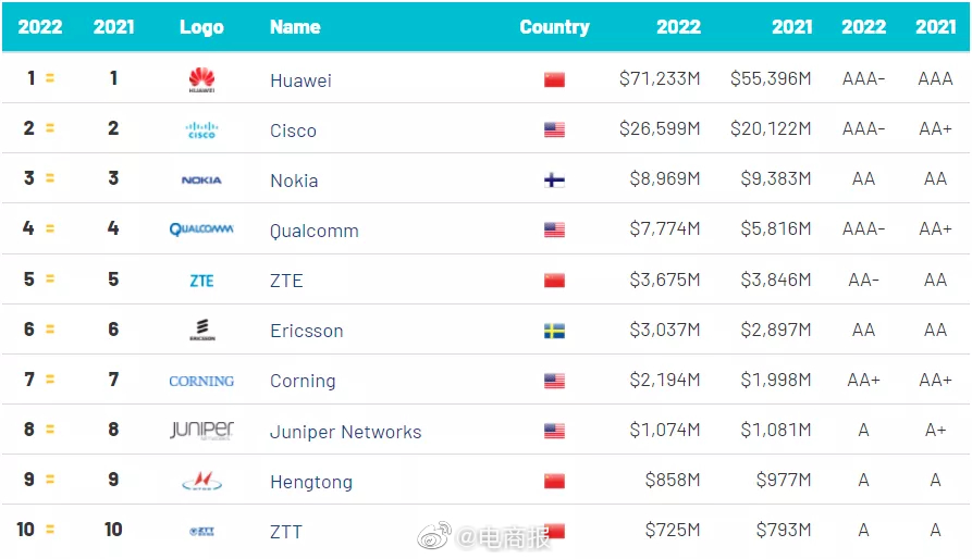 【#华为成全球最有价值电信基础设施品牌#】BrandFinance发布《Telecoms 150 2020》年度报告,华为、中兴、亨通、中天四家中国厂商入选全球十大最有价值电信基础设施品牌榜,其中华为位居榜首。