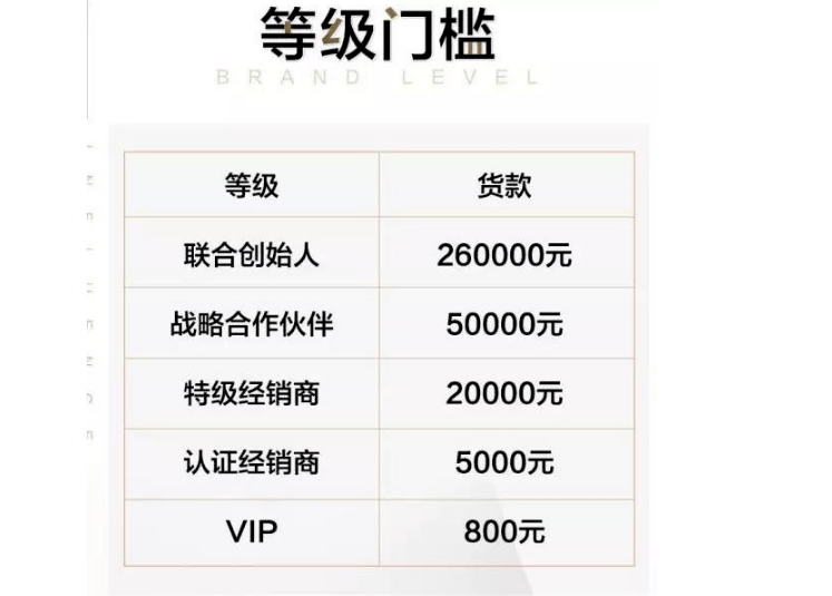 此外,朵色存在五级代理模式,分别是加盟门槛为800元的VIP、门槛为5000元的认证经销商、门槛为2万元的特级经销商、门槛为5万元的战略合作伙伴,及门槛为26万元的联合创始人。