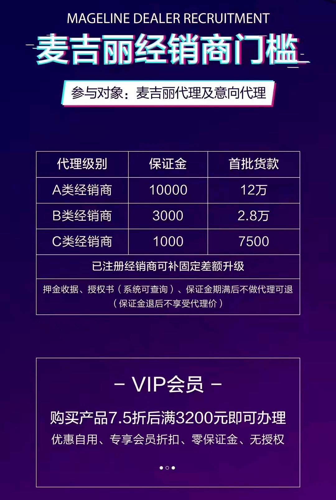 目前,麦吉丽线上代理分为3个部分,第一部分是A类经销商,首批购买的货款为12万元,并需要缴纳1万元的保证金,其次的B类、C类经销商首批货款分别为2.8万元、7500元,对应的保证金额为3000元及1000元。